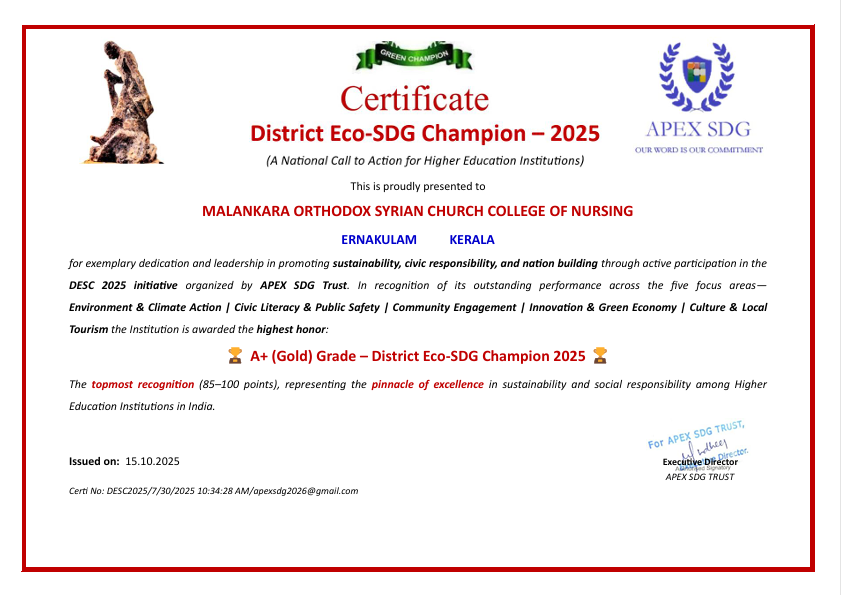 M.O.S.C. College of Nursing is certified and recognized as the District Eco-SDG Champion 2025 with an outstanding performance grade of A+. The institution has successfully demonstrated its support for the Sustainable Development Goals and social responsibility by conducting and showcasing several Eco-SDG and skill development activities, thereby contributing to national development.